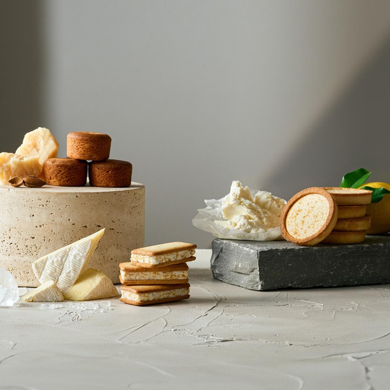 カマンベールチーズやパルメザンチーズなどの個性豊かなチーズに、Salt(塩)、Nuts(ナッツ)、そしてLemon(レモン)といったベストマッチな素材をプラス。それぞれの組み合わせを存分に堪能できるよう、サンド、ガレット、タルトという異なるカタチに焼き上げました。