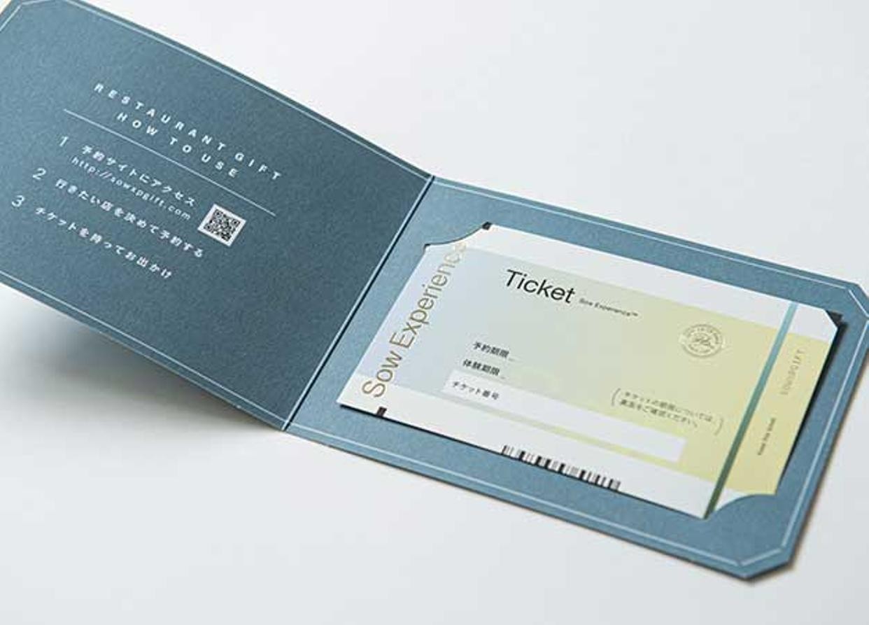 予約時や店頭で使用するチケット。招待状のように、専用の台紙に収めています。