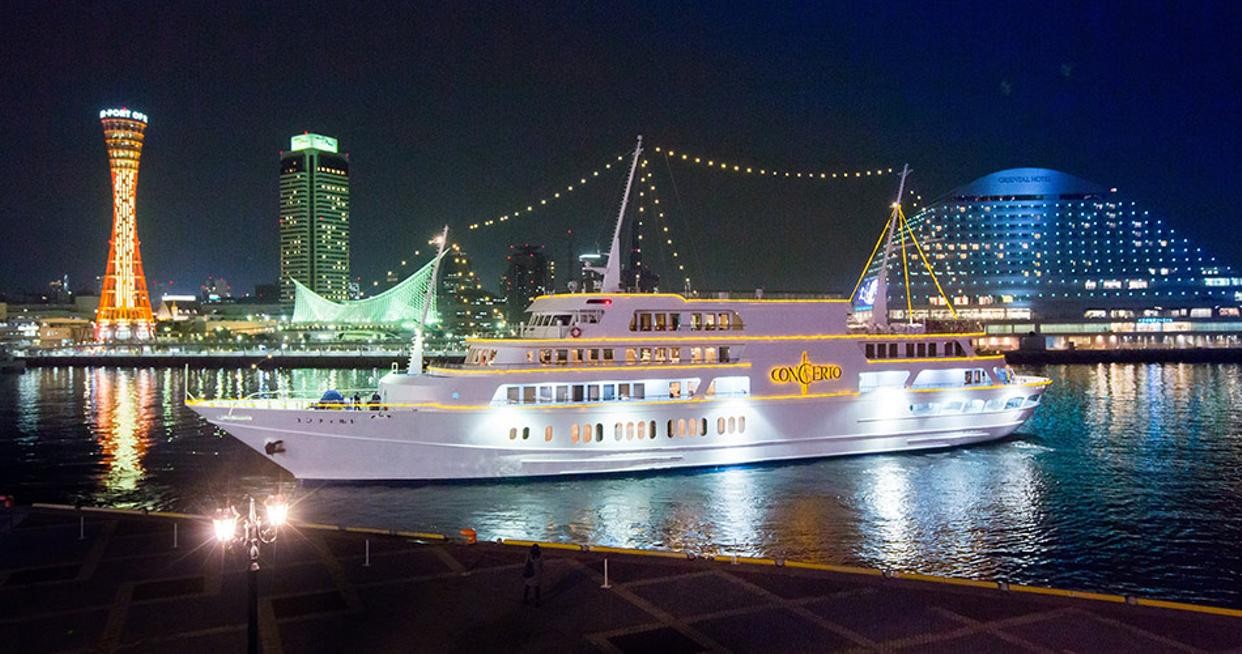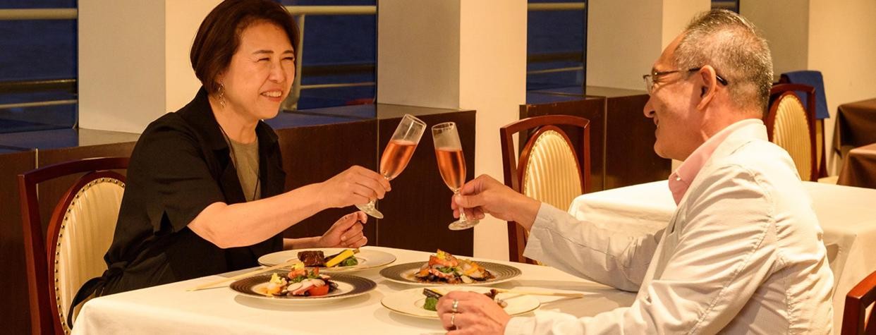 船は東京・神戸から出港。都市の夜景を眺めながら、2人で豪華なディナークルージングを楽しめます。特別な日にふさわしい、本格的なコースディナーが魅力です。
