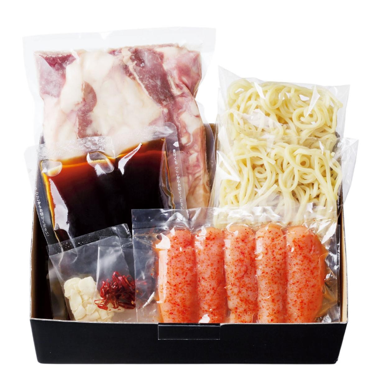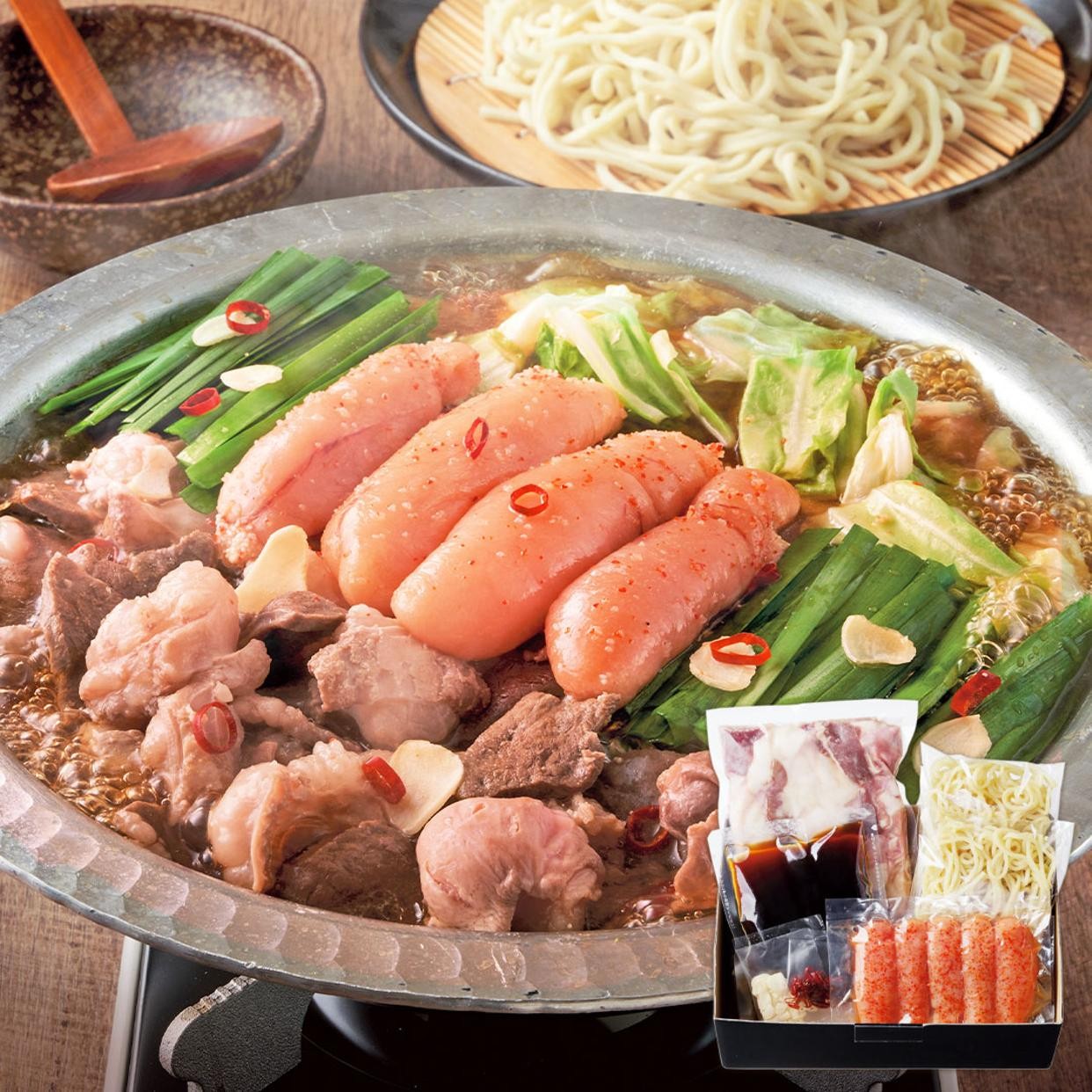 約3~4人前/牛もつ350g、スープ(濃縮)200g、ちゃんぽん麺150g×2、にんにく2.5g、唐辛子0.5g、無着色辛子明太子150g