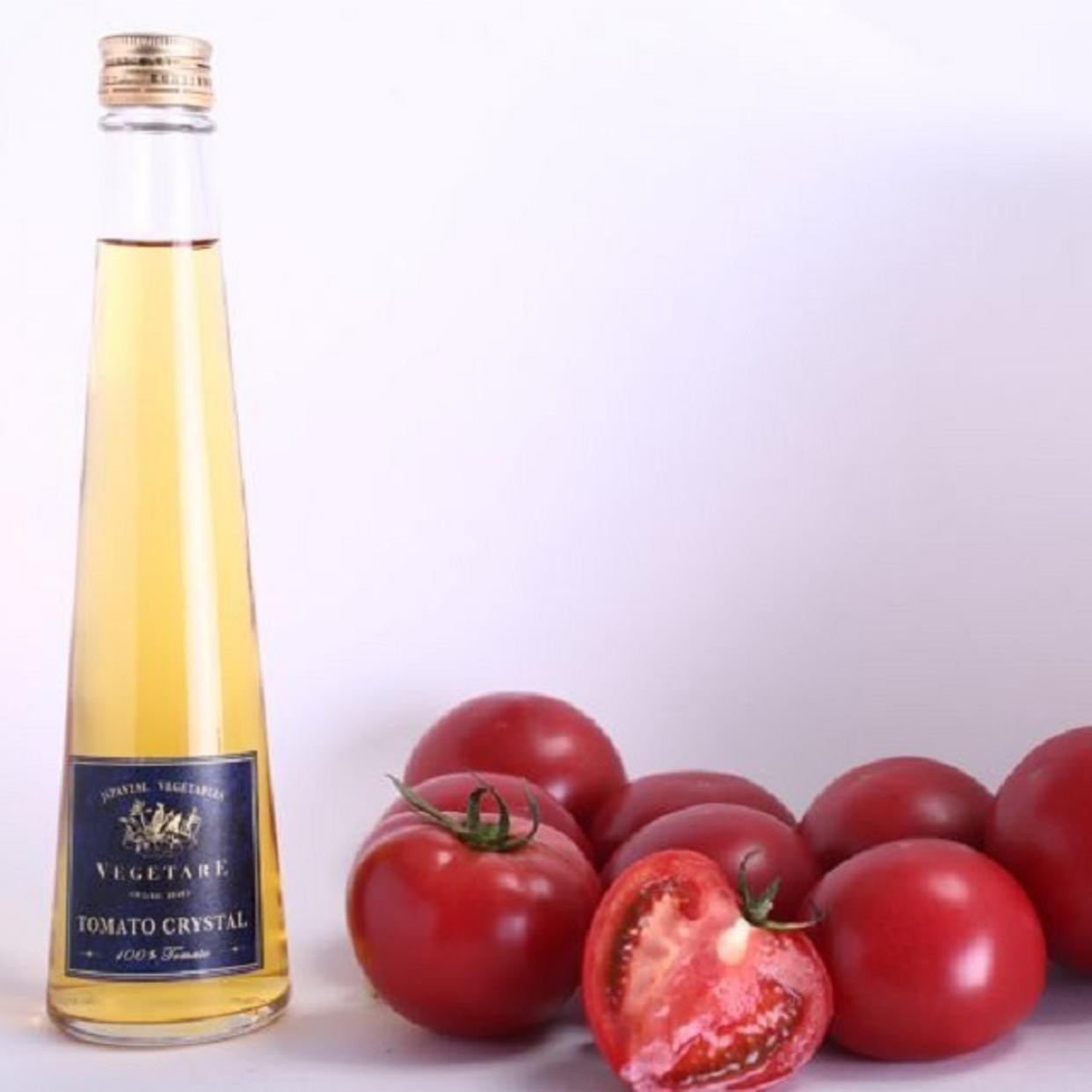 日本酒・大吟醸の『雫取り』という伝統技術を応用し、自然の重力のままに滴り落ちる上質なトマトのエキスのみを一滴づつためたものです。使用しているトマト は熟練の農家さんが、有機質土壌で農薬に頼らず、水分量や甘味と酸味のバランスにも気を配りながら大切に育てた福井のブランド野菜・越前トマトを100% 使用。1本に約10個分のトマトの旨みと栄養がつまっています。