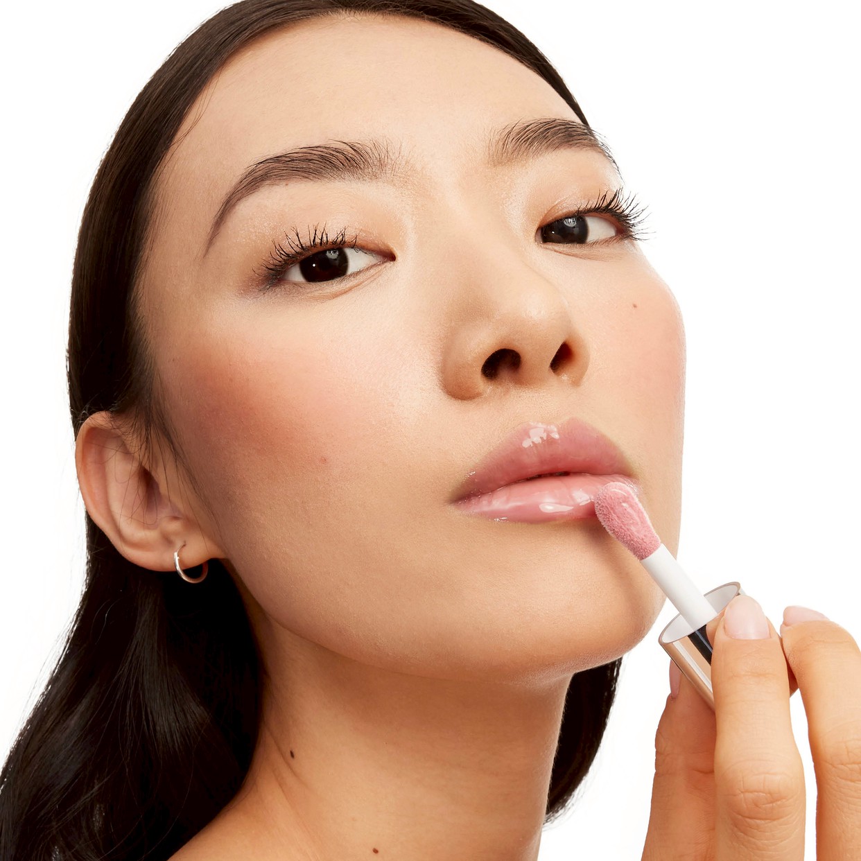 リップカラーと重ねてつける際は、唇の中央部分からつけて全体になじませると、立体感がより際立ちます。