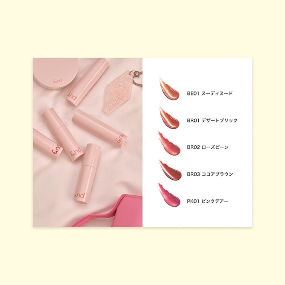BE01 ヌーディヌード/BR01 デザートブリック/BR02 ローズビーン/BR03 ココアブラウン/PK01 ピンクデアーの5色展開。